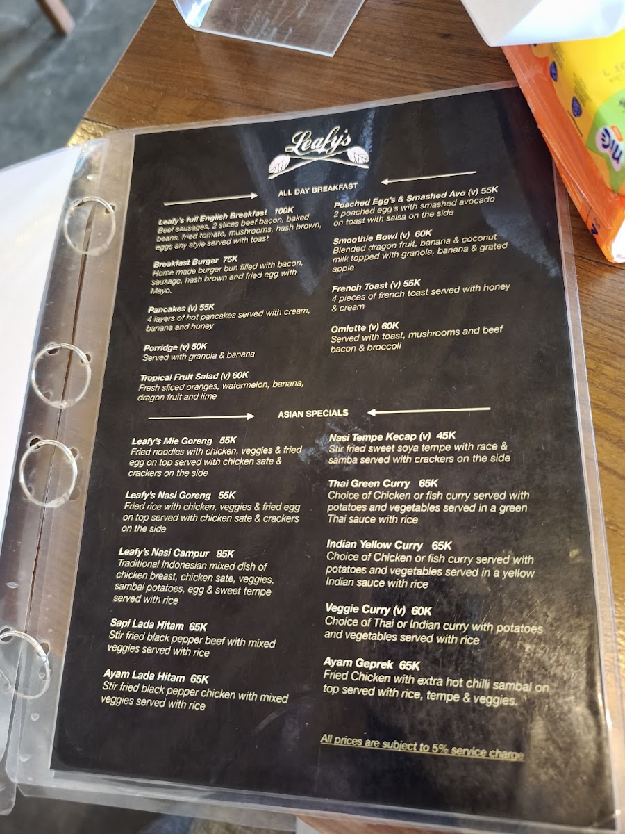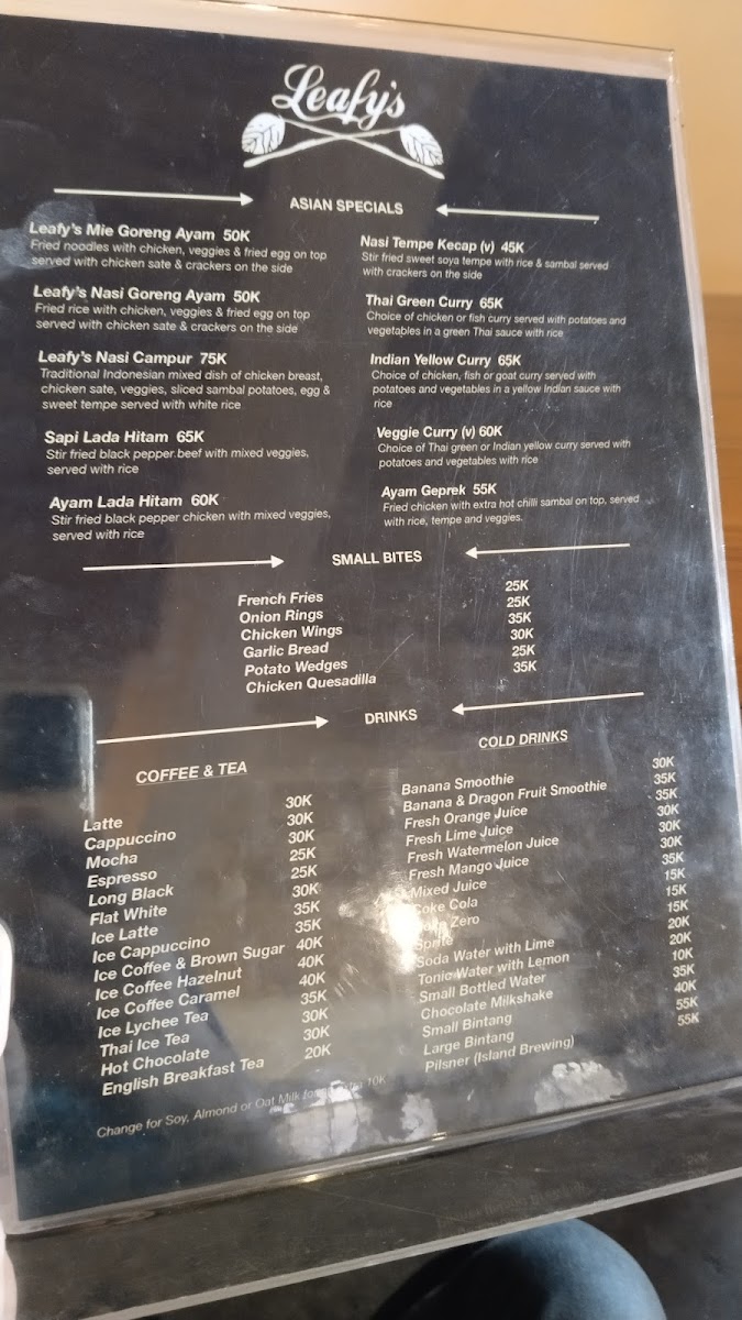 - Customer favorites: cheeseburgers, Leafy's salad, nasi goreng